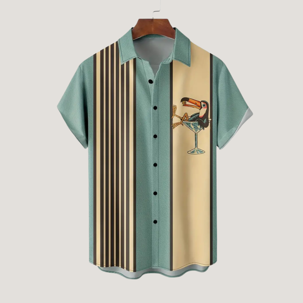 Met een opvallende print van een toekan in een cocktailglas en brede verticale strepen straalt dit overhemd pure vrolijkheid uit. Perfect voor op vakantie, zomerse feestjes of gewoon als je zin hebt in een gedurfde, relaxte stijl.